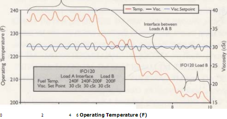 理解為什么混合物粘度有所不同負荷負荷只有一塊拼圖。結果如何理解不同的粘度是另一回事。不同等級的船用重油當形式層儲存在相同的儲油罐。作為一個結果,以維持粘度設置點、燃油的燃燒控制系統必須應對急劇變化時對燃油粘度變化之間的接口的掩體滿足燃油駁運泵抽吸。(見圖查看插入的一個例子IF0120不同負荷)。圖說明了一個相當大的變化IF0120粘度的層之間所負荷圖作為°和°B。這需要改變粘度降低燃料溫度從240°F到200°F為了保持粘度設置點上30 cst。認為會發生什么事假如操作者僅靠一個理論溫度設置點來自典型的燃料燃燒曲線。小費會犯規燃燒器更加頻繁的排放會受到不良影響。
